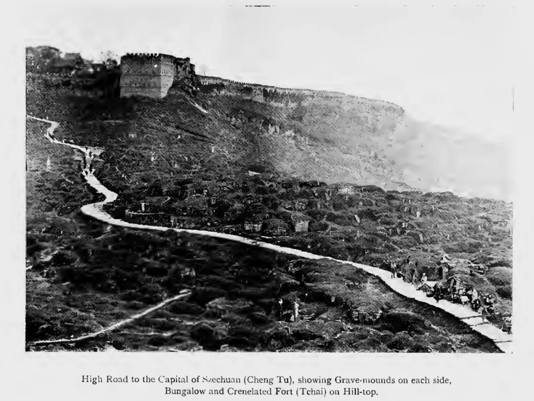 出重庆城(Ch‘ung-k‘ing)数英里内,目力所及之处,道路两侧唯有连绵不绝的墓碑和坟冢。许多墓穴被称为生基(Shêng-chi),据我所知,这是两百多年前收复四川(Sz Ch‘uan)的战争致人口锐减后,由善心人士为安置遗骨所建。坟冢间零星散布着蛮子洞(Mant-sz Tung),即原住民的穴居遗迹,外观几乎与生基无异。再次欣赏到大江(即岷江<Ming-Kiang>或欧洲人惯称的扬子江<Yang-tsz>)的壮阔景象,不禁精神一振。当我辨认出上次自綦江(Ki-Kiang)辗转归来经过的河道弯角时,仿佛每一块礁石、每一处激流都恍如故友。