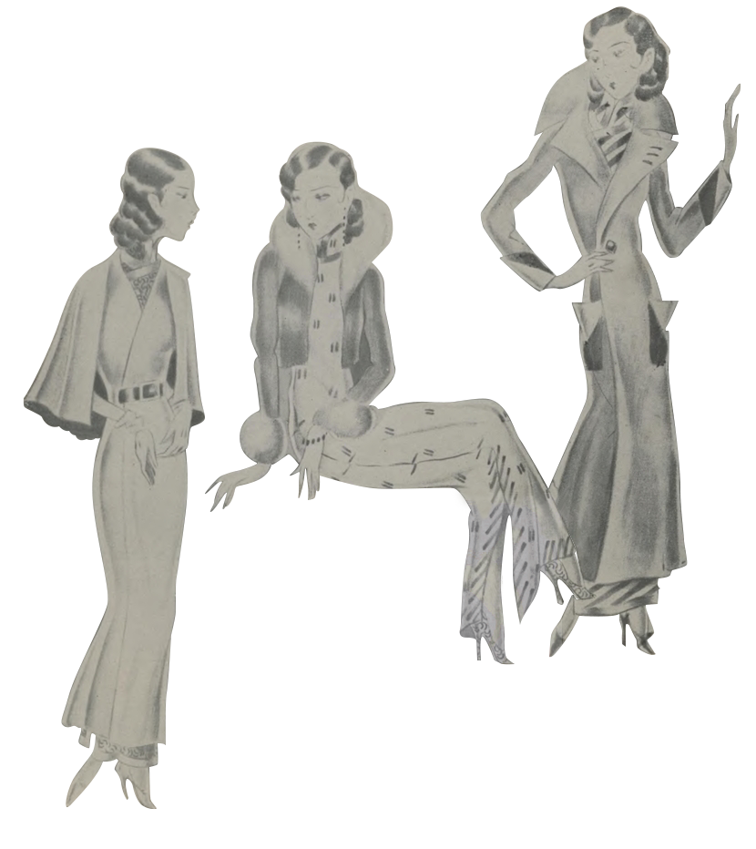 在最近的过去,女性的装束。旗袍—以轻輭的绸缎或呢绒来制就适合体态的单夹旗袍,这是装束上的一个最显明的进步,但是单夹的旗袍,当然不能御寒,因此大衣一袭,为现代装束上必须物件。这次所贡献于读者的三种新装束,就是长短不同的春大衣,或者还能切合这几时天气的需要。左边第一种是附有短斗篷的长大衣。质料的选择,宜以淡素色的薄呢来制。腰间须用一条深同色的皮带。倘能以最鲜明的朱红呢为衣,以黑漆皮制带则尤觉富丽。不过这种色调,是只合于年轻而娇小的姑娘们的。第二种以皮领皮袖作装饰的条子丝绒的短外衣,轻便玲珑,赴宴会时,加在华丽的旗袍上面,最是适宜的。第三种,是和现在最流行的大衣大同小异,就是上面的领子和下面的下摆特别的宽大是转为春天旅行时所需要的服装。上述的三种,并没有过分的奇特的地方。