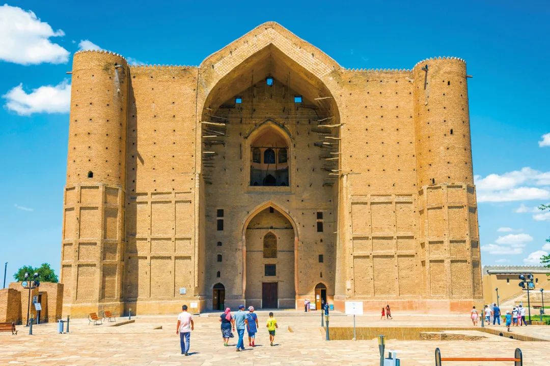 霍贾·艾哈迈德·亚萨维是公元10世纪初的宗教圣人、伊斯兰教苏菲派的创始人,他以诗歌的形式传达圣喻,深受当地民众爱戴。他的陵墓位于哈萨克斯坦南部的图尔克斯坦市,是帖木儿王朝规模最大、保存最完好的重要建筑之一。陵墓在建造过程中首次使用拱顶结构、釉面瓷砖镶嵌、空间布局等建筑方法与理念,标志着一种全新建筑风格的开端。