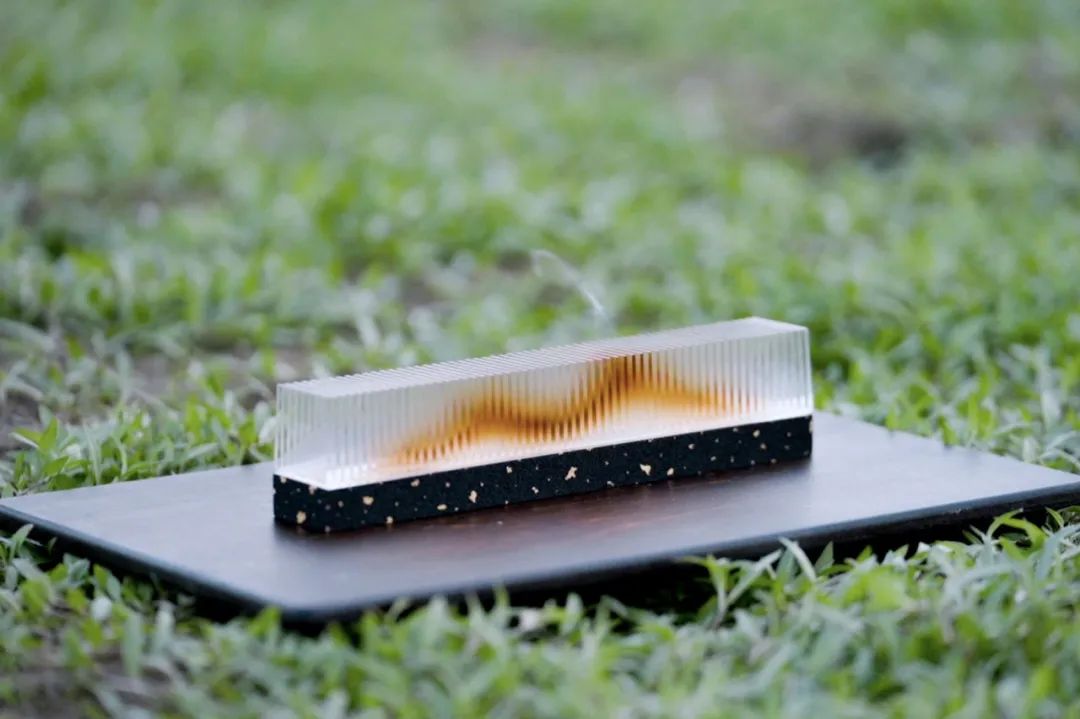 漆器质感通常是反光的,在设计一款香插底座时,邱凡芝用了莳绘中的砂糖干漆,把白砂糖加热,不停翻炒,最后变成炭,碾碎成粉之后涂抹,它原本都是隐藏在漆下面,但邱凡芝想到,其实它能够让器物呈现出极端哑光的效果,和大家想象中的漆器很不一样。