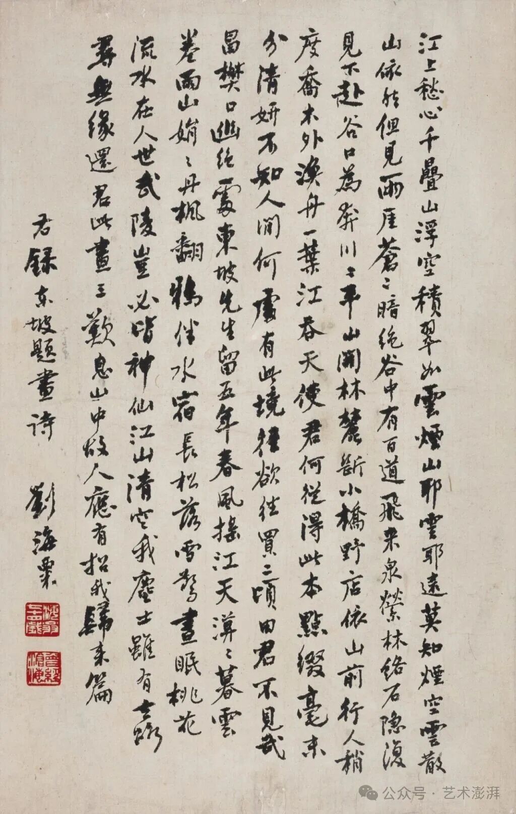 《录东坡题画诗》(未署年代,按书风或为1970年左右):“江上愁心千叠山,浮空积翠如云烟。山耶云耶远莫知,烟空云散山依然……渔舟一叶江吞天。使君何従得此本,点缀毫末分清妍。不知人间何处有此境,径欲往买二顷田。君不见武昌樊口幽绝处,东坡先生留五年……山中故人应有招我归来篇。”此书简直就是老年的刘海粟对东坡《寒食诗帖》与《赤壁赋》的意写致敬,“渔舟一叶”、“归来”等字,俱可见出浓郁的苏味。