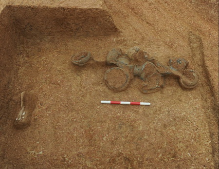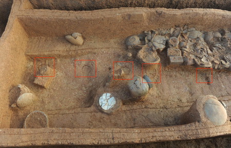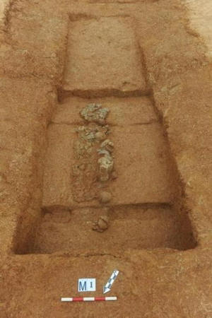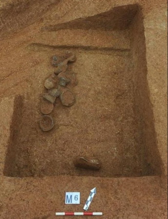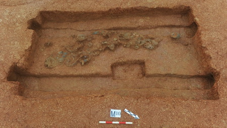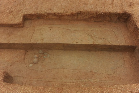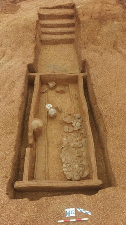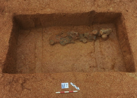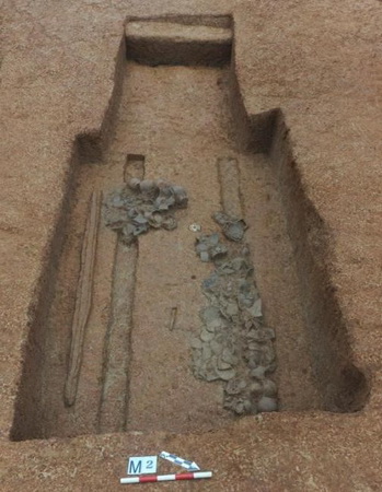 长方形竖穴土坑墓,墓底多为2个横向枕木沟,填土也相对简单,近墓底内四周一般由红褐色土(与网纹红土相似)先行填筑,较致密,其余填土基本相同,多为灰褐色花土,夹杂一些青灰色黏土,较疏松。带墓道的竖穴土坑墓,墓底多为2个纵向枕木沟,填土相对较复杂,墓道填土一般由含有较多网纹红土小颗粒的土填筑,整体呈浅红褐色。墓室内填土均可见较多的青灰色黏土块,但每个墓葬填土层次不尽相同。墓道与墓室相交区域存在多层交错填筑的现象。