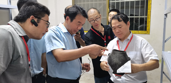 与会学者观摩赤壁大湖咀遗址出土春秋时期锡扁壶
