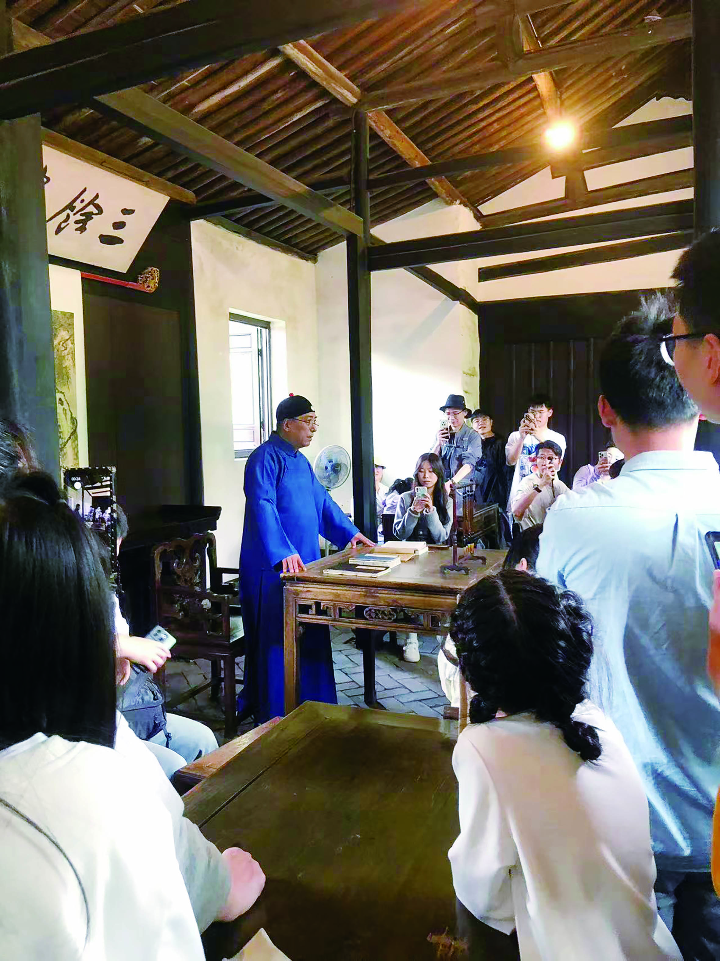 在三味书屋旁边的“三余书屋”内,游客们正在参与私塾演示活动,与老先生一起念念《三字经》,对对课,亲身感受鲁迅当年读书的意境和绍兴旧时的私塾文化。