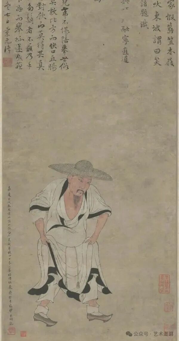 明代朱之蕃 《临李公麟苏轼像轴》,描绘的是苏轼被贬时逢雨,向农人借雨具披蓑戴笠归家