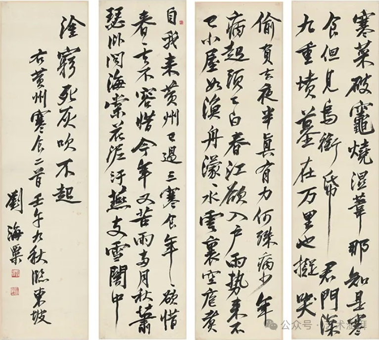目前可见的刘海粟临摹东坡书法,最早的是1942年临东坡《黄州寒食帖》四条屏,放大临写,是抗战时期刘海粟为募款下南洋,被困于印尼时,每日临池,早上临东坡《寒食帖》,下午临黄山谷《松风阁帖》,此一时期前后且有临文徽明等明人书迹,相比较而言,临东坡《黄州寒食帖》虽说亦试图亦步亦趋东坡书迹,形上亦见扁侧,但反而见出瘦劲处,东坡“屋”“那”等字固有的丰腴亦趋于淡化。