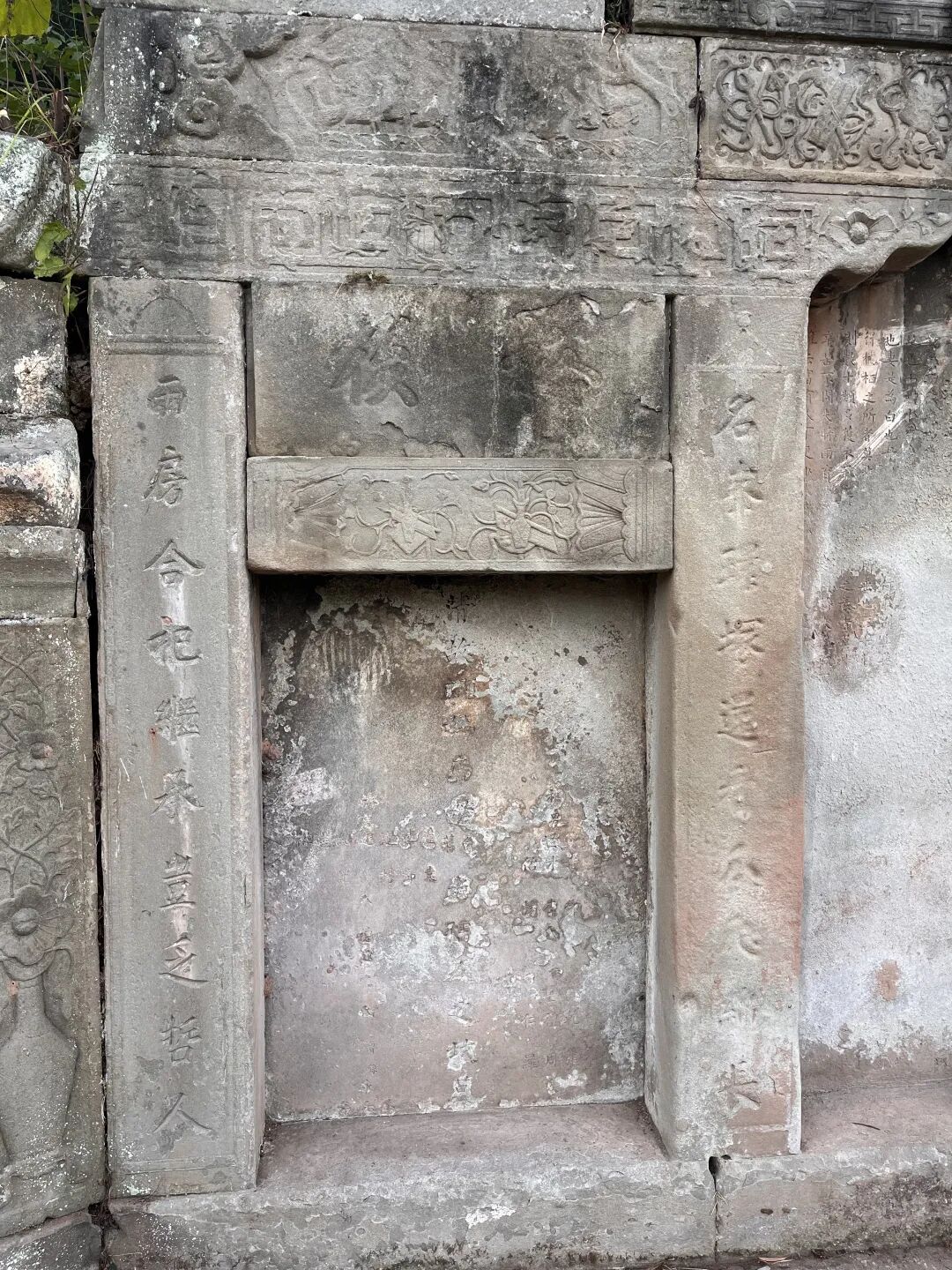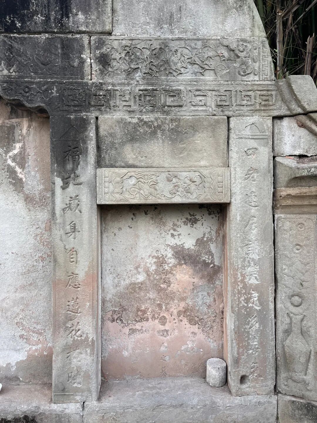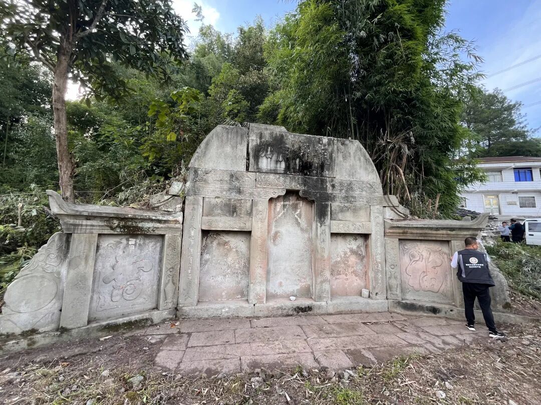2024年10月中旬,作为定点指导,与梁平四普调查工作组的同志一起对梁平境内的第三次全国文物普查已登录文物进行了实地复核。在梁平区袁驿镇石榴村六组,发现了一座记录中国古代特殊继承习俗的清代石围土冢墓。该墓名为石榴村唐氏夫妇合葬墓,墓葬整体坐西朝东,地处浅丘腰部,地势西高东低,地形平缓开阔。墓葬形制为带仿木结构牌楼及八字挡墙的石围土冢墓,通宽约9.2米、残高约3.6米、进深约8.6米,占地面积约115.94平方米。牌楼四柱三间,碑帽不存,其下匾额阳刻楷书“龙蟠虎踞”,额枋中段刻八仙兵器浅浮雕、两侧饰花草卷云纹。牌楼明间宽1.06米、高2.3米,明间柱(宽0.32米、高1.4米)阴刻楹联“名峰□塚远秀□□绵长,福地藏身自应莲花掩映”,嵌套墓碑下部铭文大多风化湮灭不可辨识,中间竖题年号“同治三年”;次间宽0.99米、高1.4米,次间柱(宽0.32米、高1.4米)阴刻楹联“两房合祀继承岂乏哲人,四老连居谈笑定多喜气”的楹联,上悬副匾文字模糊。八字挡墙通宽约1.8米,阳刻左“福”、右“寿”,外接抱鼓圆雕。